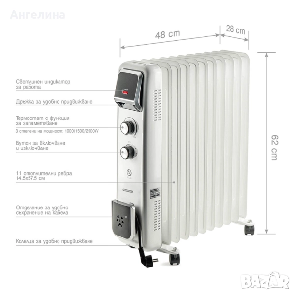 Маслен радиатор 11 ребра, р-р 145x575mm Термостат за контрол на температурата Бутон вкл./изкл. с 3 степени на отопление - 1000/1500/2500 W Светлинен индикатор Място за съхранение на кабела Колела за лесно транспортиране Размери (Ш/В/Д): 480 X 282 X 619 мм 2500W, 220-240V/ 50-60Hz