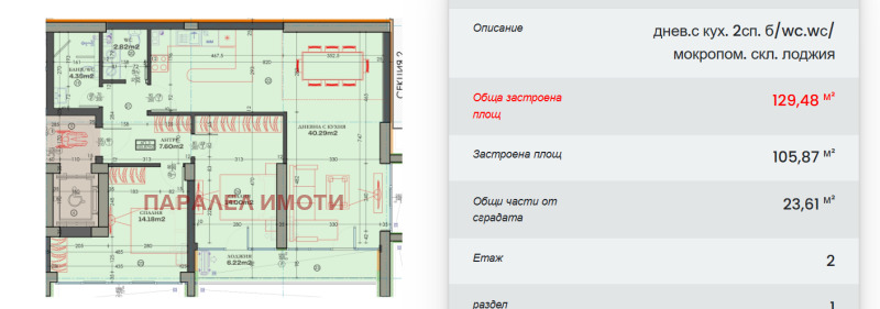 Паралел имоти предлага за продажба апартамент с две спални в новострояш се комплекс.Жилището се намира на ет.2 .Състои се отдневна с кухненски бокс,две спални,баня с тоалетна,мокро помещение(втора тоалетна),склад и лоджия.