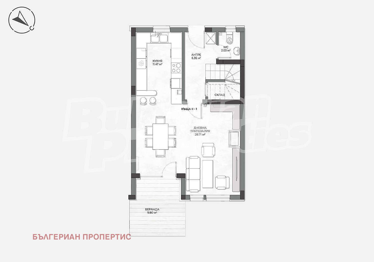 Първи етаж - светла дневна с кухня и директен излаз към собствен двор и веранда, идеален за сутрешно кафе или вечеря на открито; санитарен възел.