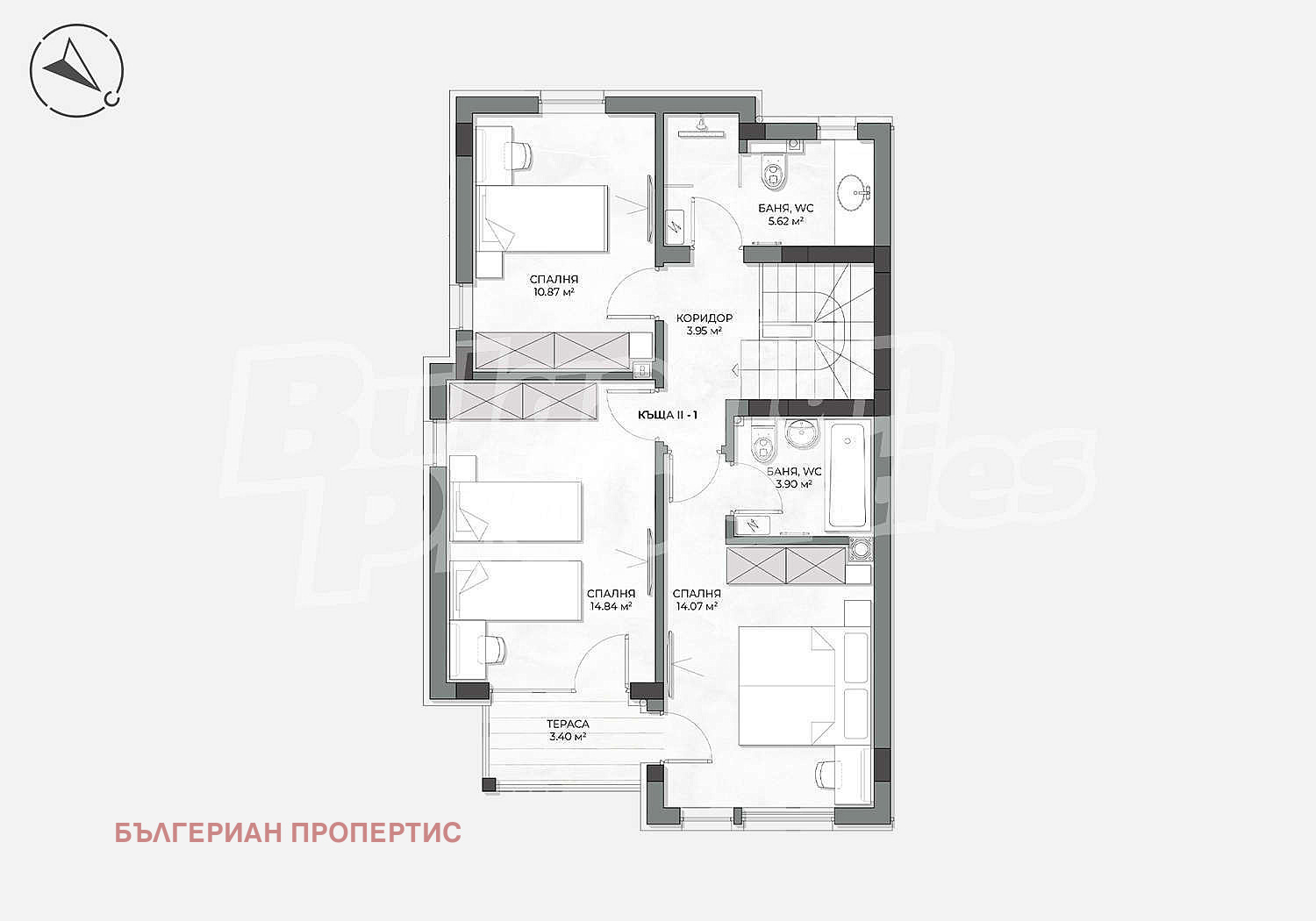 Втори етаж - три спални, две бани с тоалетни, антре и тераса с чудесна гледка към Родопите и Стара планина.