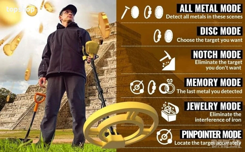 PINPOINTER. Независимо дали търсите злато, сребро или реликви, тези режими ви помагат да се фокусирате върху ценни цели, като същевременно игнорирате нежелани предмети, което го прави идеален както за начинаещи, така и за експерти.