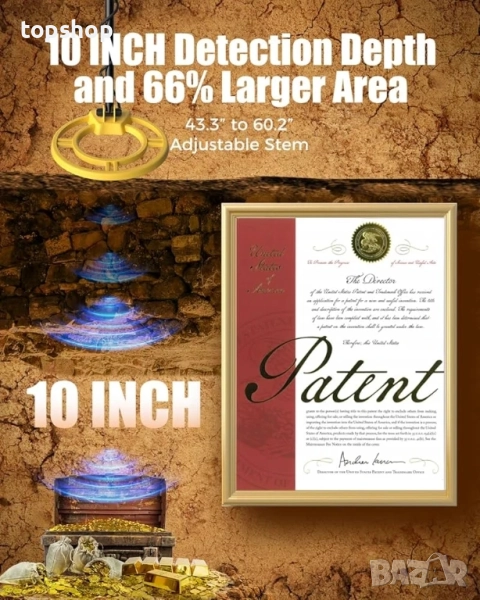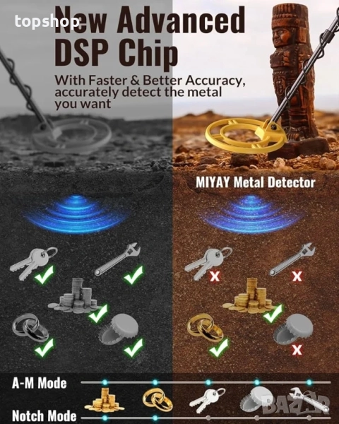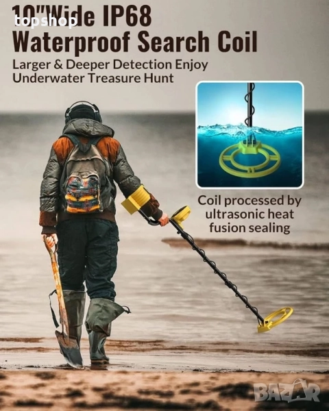 Водоустойчива търсеща бобина IP68 – 10-инчовата търсеща бобина е водоустойчива по IP68, което ви позволява да изследвате плажове, реки и плитки води за скрити съкровища до 10 инча под земята. Оборудван с подобрен DSP чип, нашият детектор предлага 66% по-голяма зона на откриване и подобрена точност в сравнение с другите. (Забележка: Контролната кутия не е водоустойчива. За използване в морска вода, намалете чувствителността, за да сведете до минимум смущенията.)
