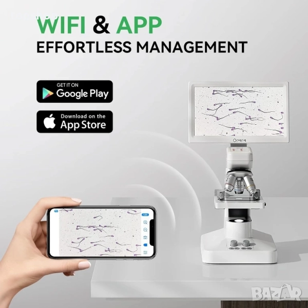 WiFi и приложение: С WiFi свързаност, микроскопът позволява гледане, мащабиране и заснемане на снимки/видеоклипове в реално време; Файловете се запазват както на телефона, така и на SD картата, опростявайки качването и споделянето; Съвместим с устройства с Android и iOS