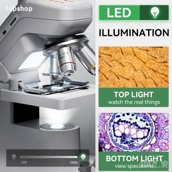 Двойна LED система за осветление: С горно и долно LED осветление, този микроскоп осигурява идеално осветление за реални обекти и образци; Дизайнът с регулируема яркост осигурява защита на очите по време на употреба.