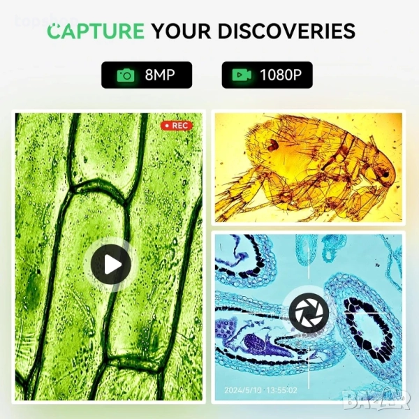 Заснемете откритията си: Комбинирайки микроскоп и камера, биологичният микроскоп заснема 8MP снимки и 1080P видеоклипове; Записването и споделянето на моменти като плуване на парамециум е вълнуващо преживяване, което създава смислени спомени