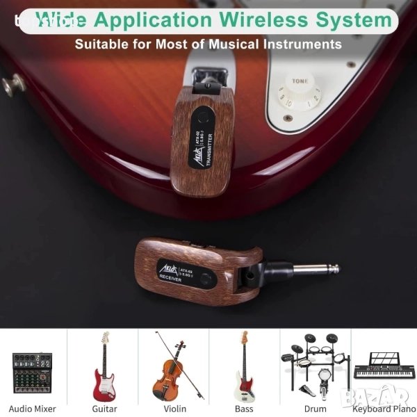 Plug and Play: Поддържа 6 комплекта устройства, работещи едновременно, безжичен предавател-приемник за китара едно към едно и без смущения; и един предавател може да предава сигнал към няколко приемника едновременно.