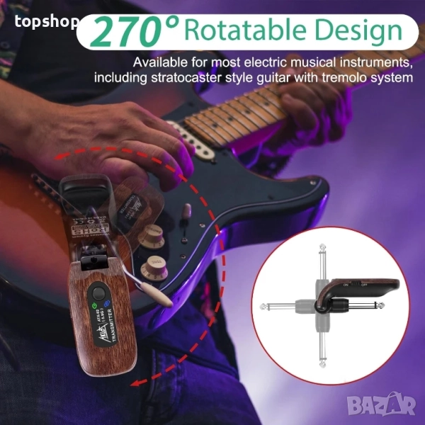 Подходящ за различни поводи: Дизайн с въртящ се на 270° щепсел. Подходяща за всички електронни музикални инструменти с 6.35 жак, тази безжична система за предавател/приемник за китара/инструмент може да се използва за електрическа китара, цигулка, бас, ефект педал, клавишни и др.