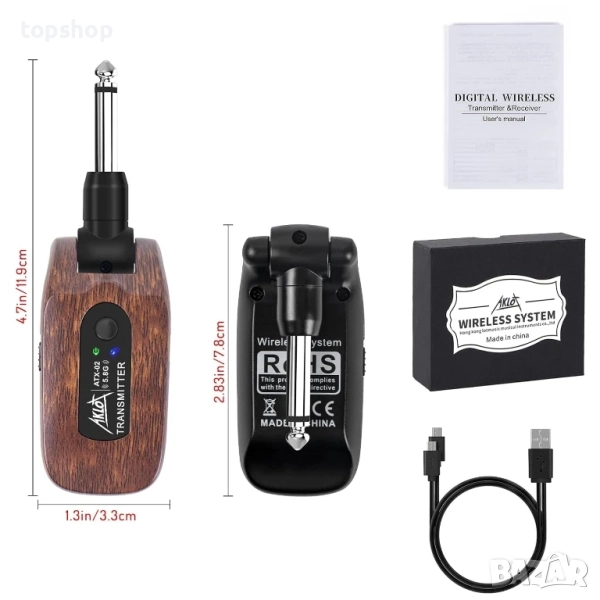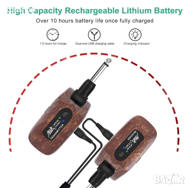 Дълго време на работа и презареждане: Вградена презареждаща се литиева батерия, работно време над 10 часа за 1.5 часа зареждане, комплектът безжичен предавател за китара се предлага с USB кабел за удобно презареждане.