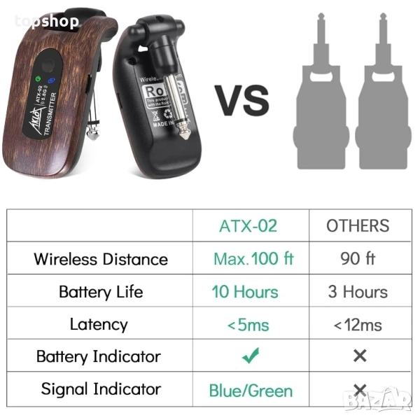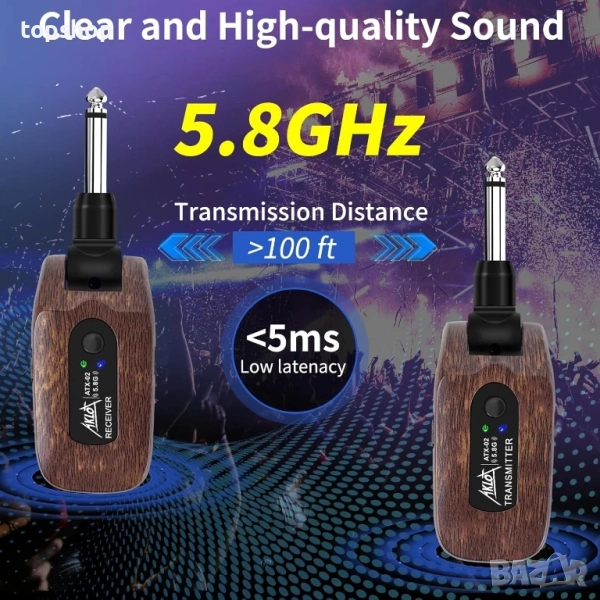 30 м стабилно и ясно предаване на сигнала: Нашата безжична система за китара използва 5.8GHz чип, некомпресирано предаване на сигнала, нисък шум и латентност, ефективният обхват е около 30 метра.