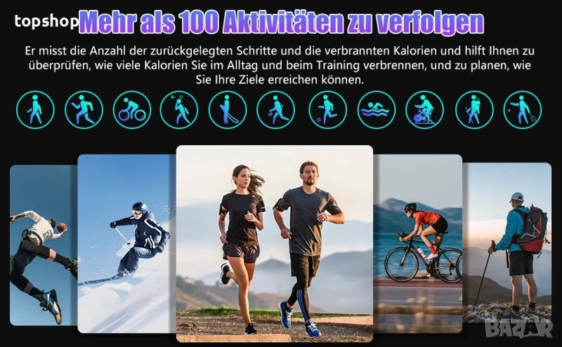 100+ спортни режима и водоустойчивост IP68: фитнес тракерът има множество спортни режими за бягане, баскетбол и други дейности, за да отговори на вашите ежедневни тренировъчни нужди. Освен това, той измерва вашите стъпки и изгорени калории в реално време и можете да видите GPS маршрута на телефона си. Фитнес тракерът може да се използва при ежедневно миене на ръце, дъжд, изпотяване и др., но не трябва да се носи при плуване или гмуркане, тъй като това би повлияло на вградения високоговорител. Забележка: Не допускайте контакт с гореща вода.