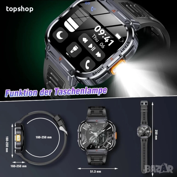 Стандартно военно качество и LED фенерче: структурата на военния смарт часовник за мъже е изработена от специален алуминиев сплав, който е преминал успешно 12 военни теста, издръжлив е, водоустойчив, прахоустойчив и може да се справи с всякакви екстремни условия. Тактически смарт часовник с LED фенерче, мощност 0.5W, обхват на осветление до 6-10 м. Независимо дали е ден или нощ, определено е чудесен спътник за вашите приключения!
