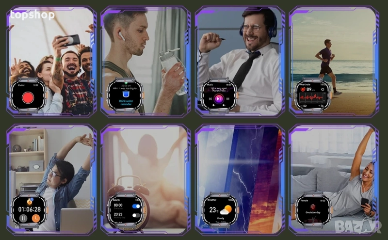 Управление на музика/камера и множество функции: Можете също така да възпроизвеждате музика от часовника, което поддържа потребителя онлайн дори по време на тренировка, превръщайки физическата активност в удоволствие. Можете също така дистанционно да управлявате камерата на вашия смартфон, като докоснете или разклатите екрана за управление на камерата. Той също така има няколко полезни функции, като прогноза за времето, регулиране на яркостта, фенерче, дихателни упражнения, хронометър, будилник, напомняне за седене, напомняне за вода, търсачка на часовник и др.