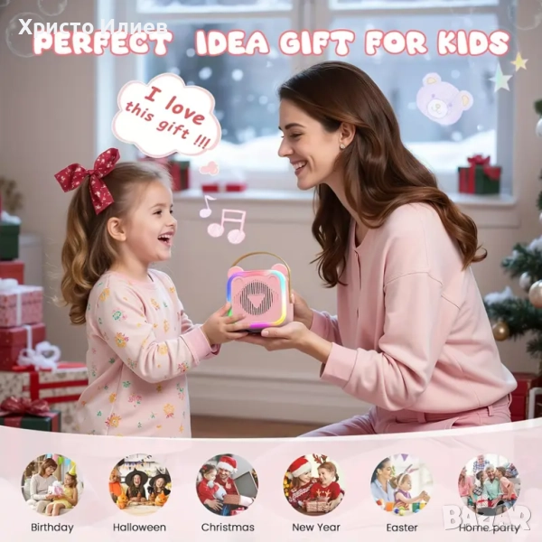 Преносимият Bluetooth високоговорител е компактен и лесен за носене, а вградената акумулаторна батерия осигурява 5-10 часа забавление. Ултрамини микрофонът може лесно да се държи дори от 3-годишно момиченце. Ъглите на караоке машината и микрофона са меки и гладки, което е безопасно за момчета и момичета на възраст 3-12 години