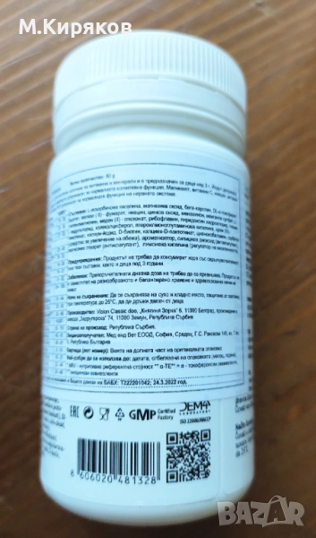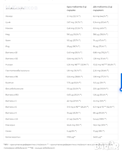 **Състав: желязо, цинк, манган, мед, хром, йод, витамини B1, B2, B3, B5, B6, биотин, фолиева киселина, B12, C, K, D3, E, магнезий, селен и бета-каротин.