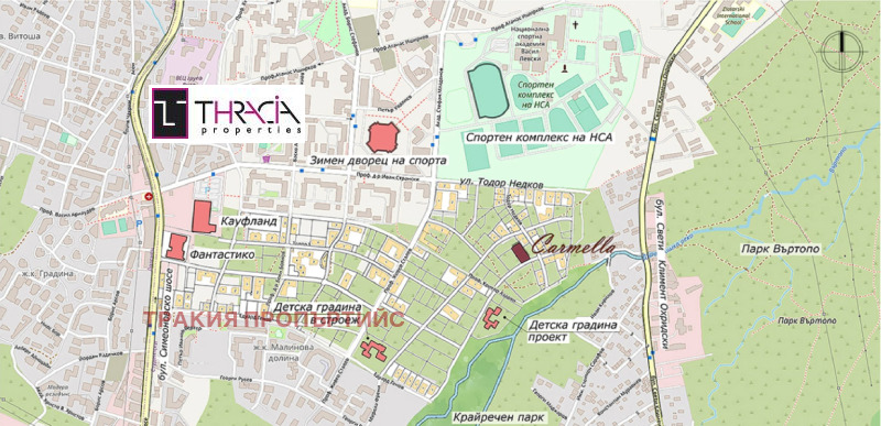 Предлага перфектна локация в нов квартал в съседство с Спортен комплекс на НСА, Зимен дворец на спорта, Кауфланд и Фантастико , директен достъп до Симеоновско шосе , а в бъдеше се предвижда изграждане на метростанция в непосредствена близост.