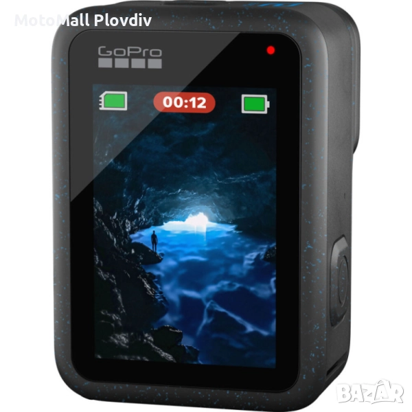 Корпусът на екшън камерата GoPro HERO12 Black е водоустойчив на дълбочина до 10 метра без допълнителен бокс и разполага с два дисплея – преден с размер 1.4″ за лесно кадриране при влогване и селфита и 2.7″ основен сензорен дисплей с touch zoom.