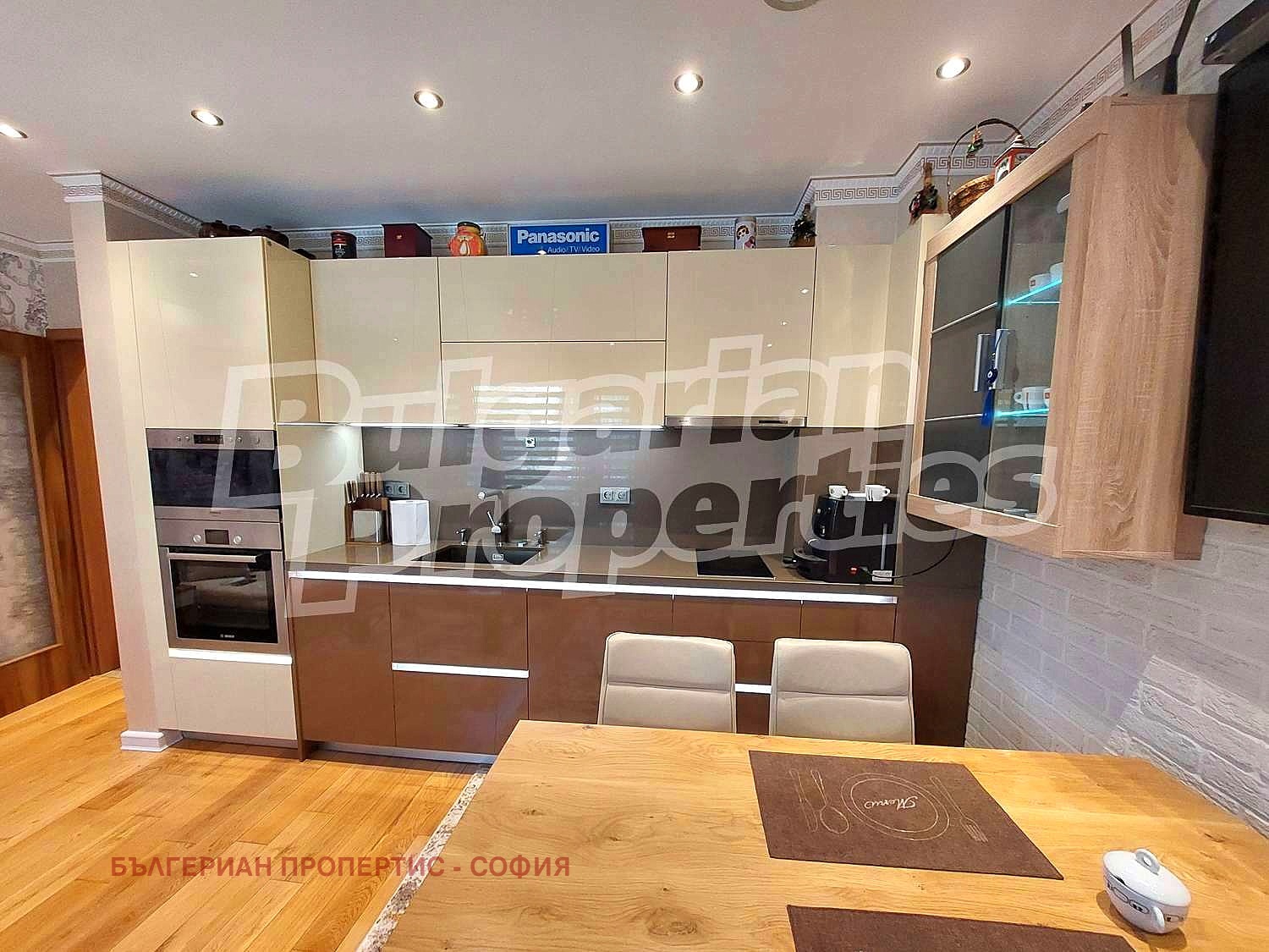 Подовите настилки са с естествен паркет 2 см, стени декоративна мазилка, ПВЦ дограма златен дъб за добра енергийната ефективност и звукоизолация. Имотът се предлага с луксозни довършителни работи, със стилното обзавеждане и оборудване от снимките. Сградата е газифицирана, но апартаментът се отоплява с 2 климатика Дайкин. Изложението на апартамента на запад и юг позволява достатъчно естествена светлина, създавайки топла и приветлива атмосфера.