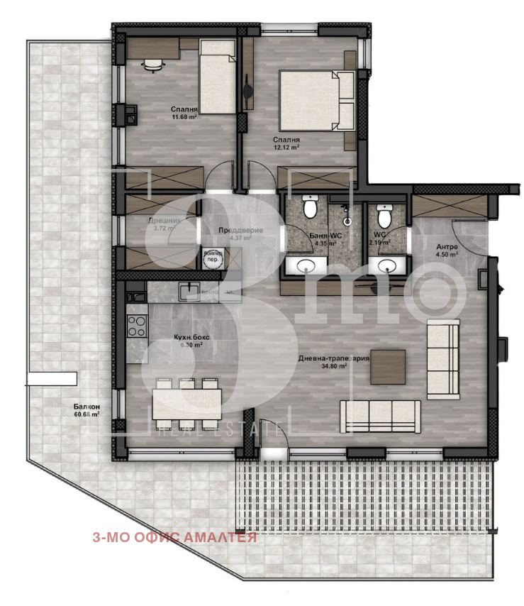 3mo агенция Амалтея продава тристаен апартамент в нова сграда с Акт 14 и срок на завършване м. май 2026 г. Жилището е със застроена площ 99,44 кв.м., обща площ 115,32 кв.м., с прилежаща покривна тераса с площ 61,13 кв.м., намира се на шести - последен етаж, с изложение югоизток-югозапад-северозапад-североизток. Състои се от дневна с кухня (41,10 кв.м.), две спални (11,68 кв.м. и 12,12 кв.м.), дрешник (3,72 кв.м.), баня с тоалетна (4,35 кв.м.), тоалетна (2,19 кв.м.), антре (4,50 кв.м.) и коридор (4,37 кв.м.) и голяма тераса (61,13 кв.м.).