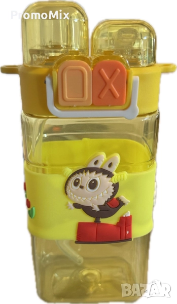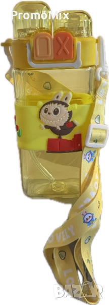 Детска бутилка Labubu 600 мл Лабубу шише регулируема презрамка Детско жълто шише Лабубу