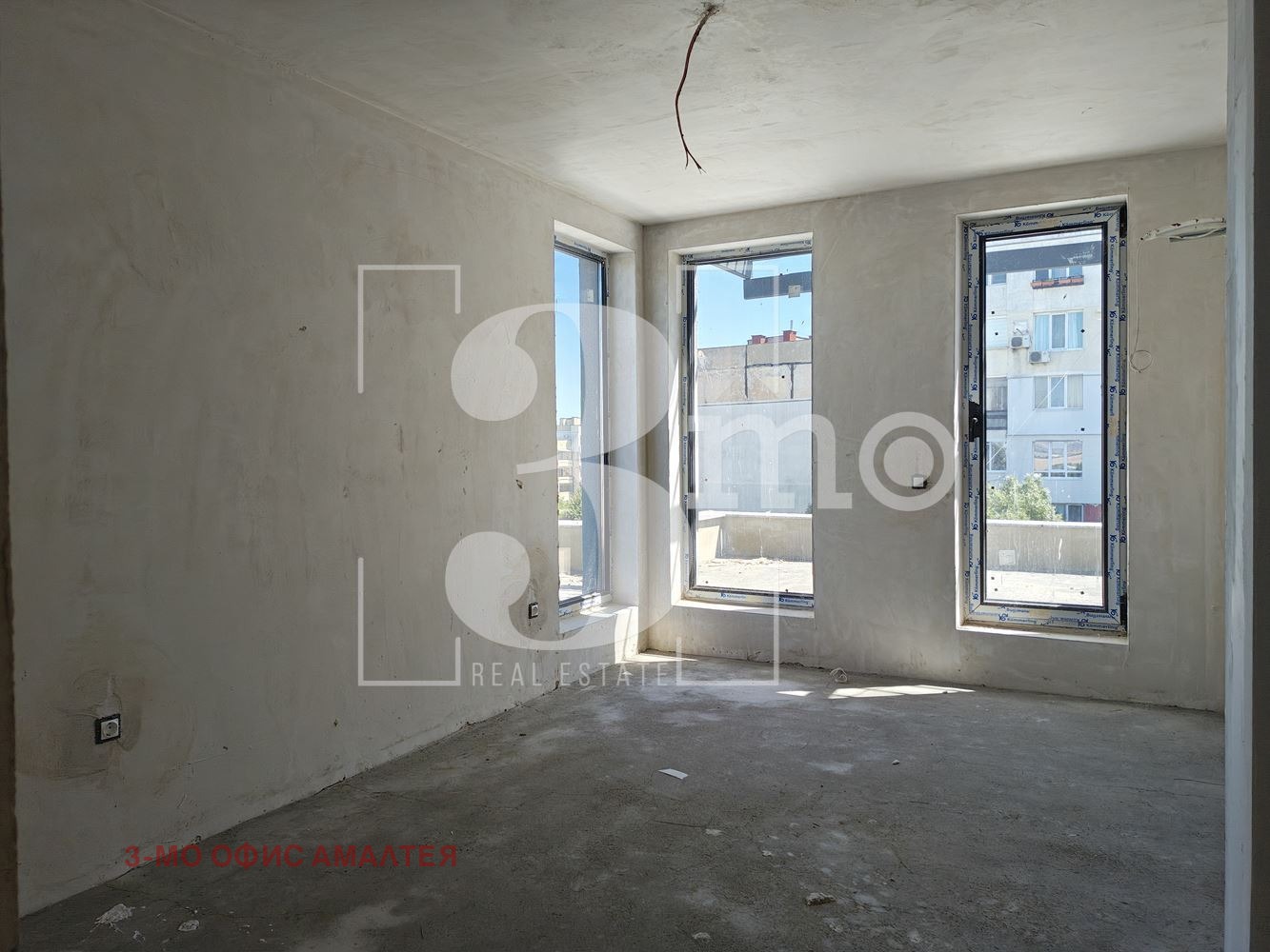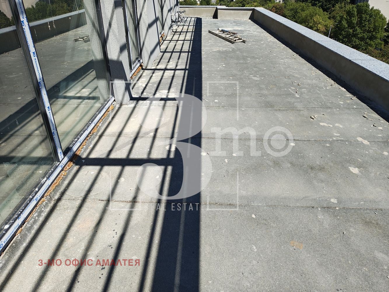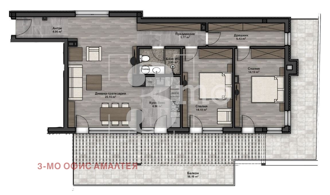 3mo агенция Амалтея продава тристаен апартамент в нова сграда с Акт 14 и срок на завършване м. март 2026 г. Жилището е със застроена площ 101,07 кв.м., обща площ 117,65 кв.м., с прилежаща покривна тераса с площ 56,12 кв.м., намира се на шести - последен етаж, с изложение югоизток-северозапад-североизток. Състои се от дневна с кухня (35,13 кв.м.), две спални (всяка по 14,19 кв.м.), дрешник (6,43 кв.м.), баня с тоалетна (3,85 кв.м.), антре (4,06 кв.м.) и коридор (5,77 кв.м.) и голяма тераса (56,12 кв.м.).