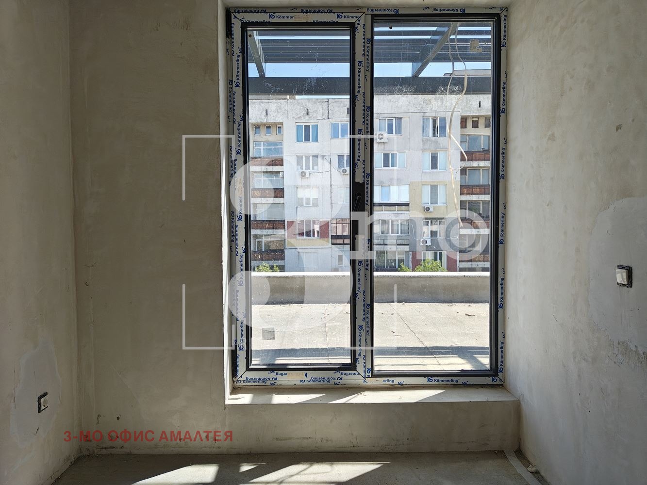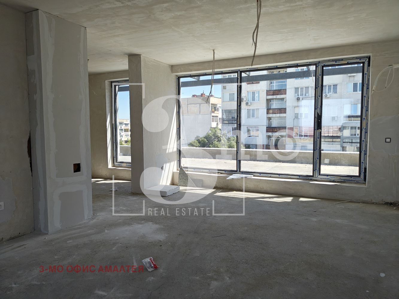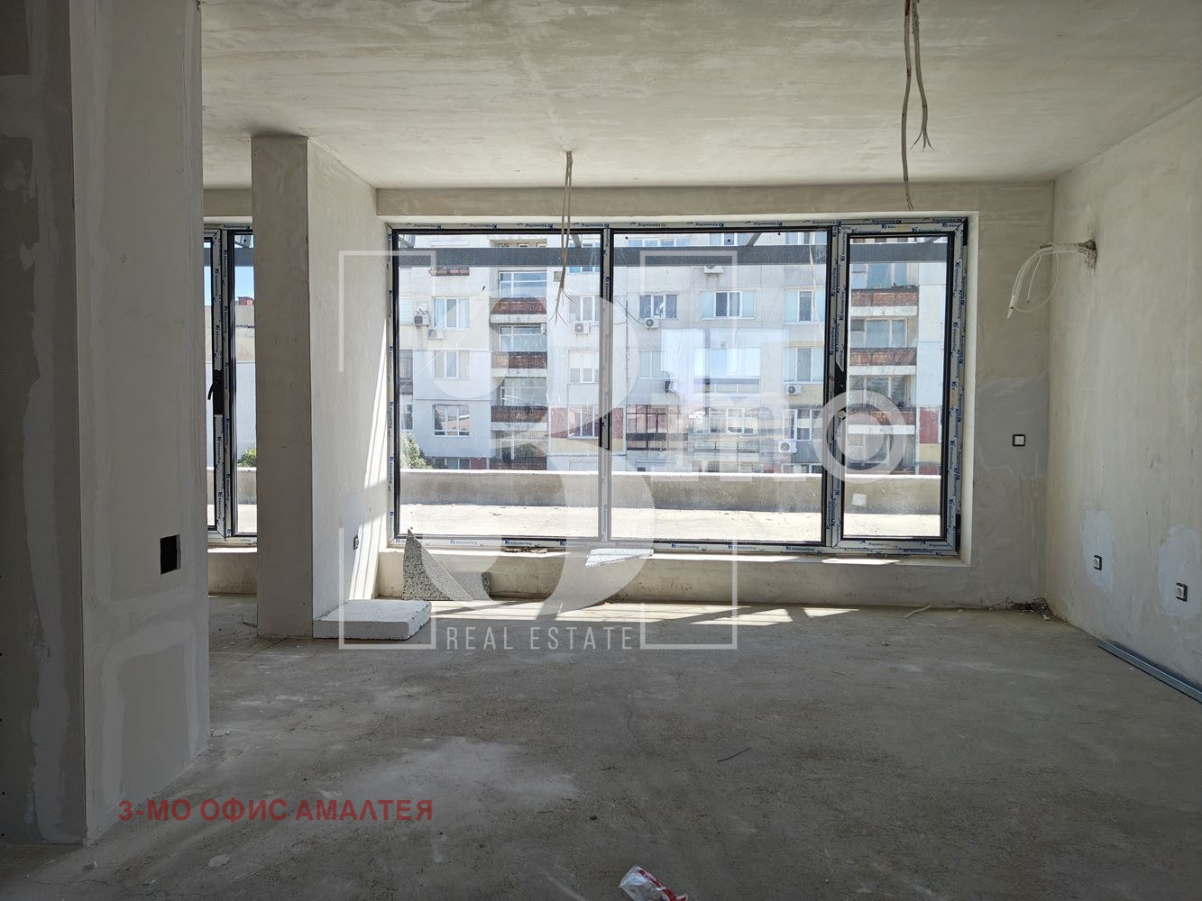 3mo агенция Амалтея продава тристаен апартамент в нова сграда с Акт 14 и срок на завършване м. март 2026 г. Жилището е със застроена площ 101,07 кв.м., обща площ 117,65 кв.м., с прилежаща покривна тераса с площ 56,12 кв.м., намира се на шести - последен етаж, с изложение югоизток-северозапад-североизток. Състои се от дневна с кухня (35,13 кв.м.), две спални (всяка по 14,19 кв.м.), дрешник (6,43 кв.м.), баня с тоалетна (3,85 кв.м.), антре (4,06 кв.м.) и коридор (5,77 кв.м.) и голяма тераса (56,12 кв.м.).