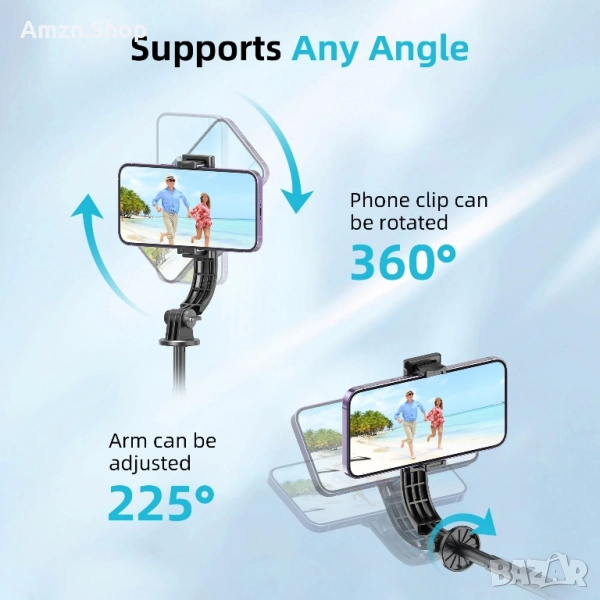 - Въртящият се на 360° държач за телефон и въртящото се на 225° рамо, което поддържа както хоризонтално, така и вертикално захващане на мобилни телефони, ви позволяват свободно да намерите най-добрия ъгъл за снимка, като просто завъртите ъгъла. Ъгълът на камерата е по-широк, а композицията е по-разнообразна. Идеален за семейни събирания и събирания с приятели.