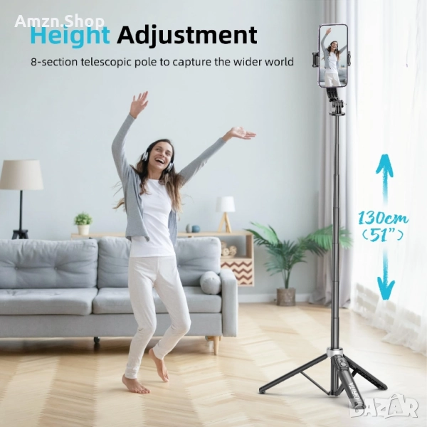 - Този селфи стик за iPhone е проектиран с 8-секционен телескопичен прът от алуминиева сплав, здрав и издръжлив, като най-дългият може да се разтегне до 51 инча (130 см), което ви позволява да снимате от различни височини, които други стативи за телефон не могат да снимат, заснемайки по-широко зрително поле. Подходящ за селфита, видеоклипове, стрийминг на живо, влогове, YouTube, TikTok, FaceTime, Instagram.