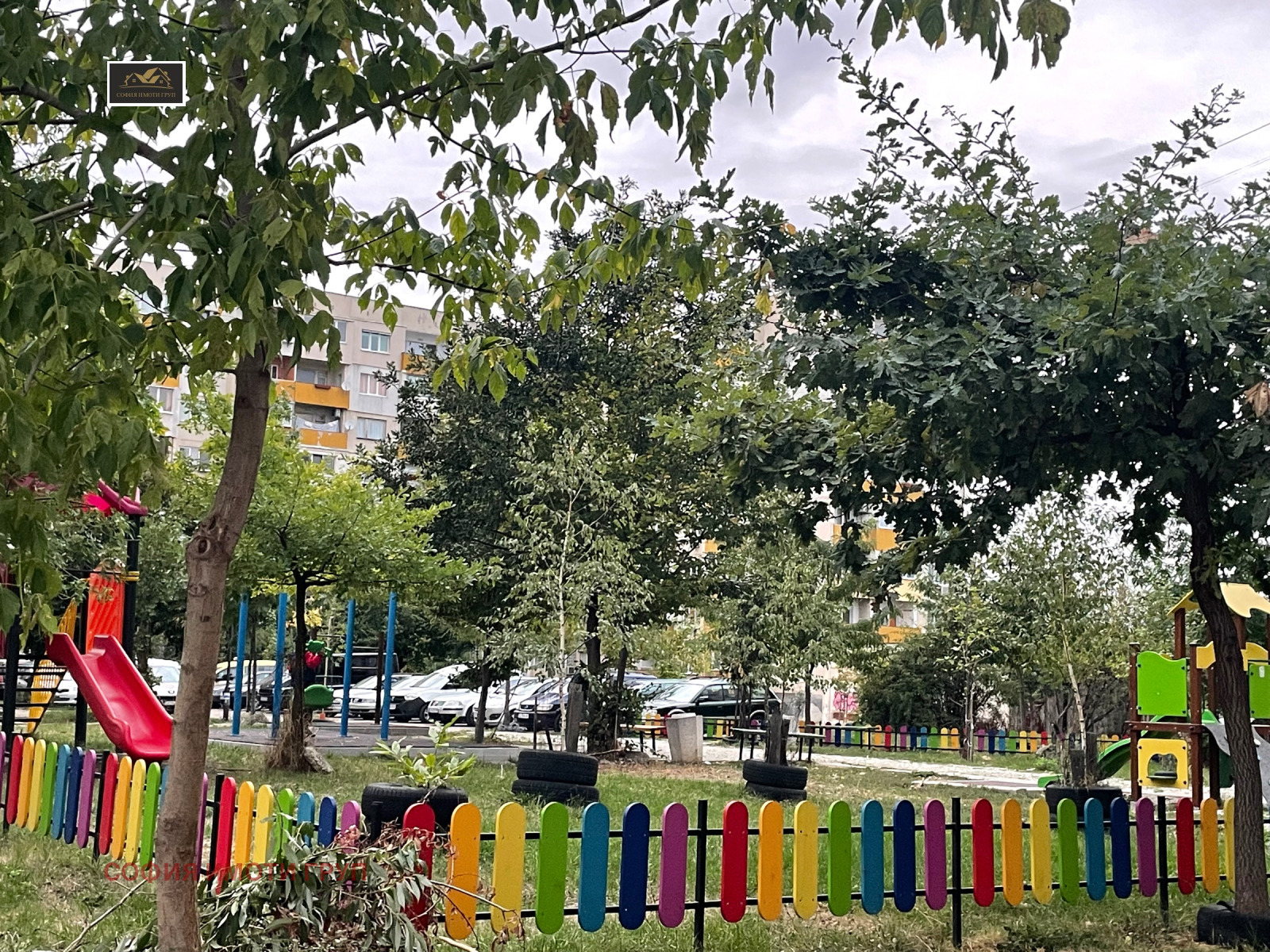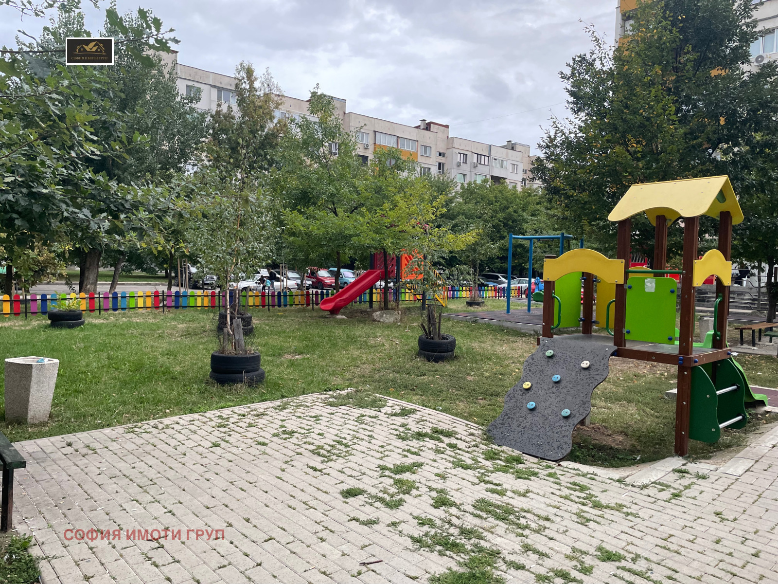 Пред блока има детска площадка и няколко магазина за хранителни стоки.