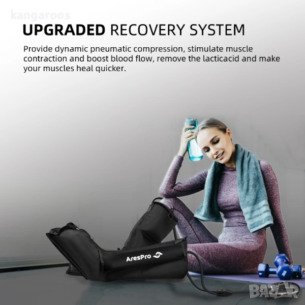 Подобряване на кръвообращението и облекчаване на мускулните болки: Разполага с 3 големи въздушни камери (стъпало, долна част на прасеца и горна част на прасеца), които се напомпват и изпускат със сложна последователност, за да стимулират месене и поглаждане с ръце, увеличавайки максимално кръвния поток в цялото тяло, облекчавайки болката и отока в краката.