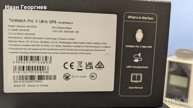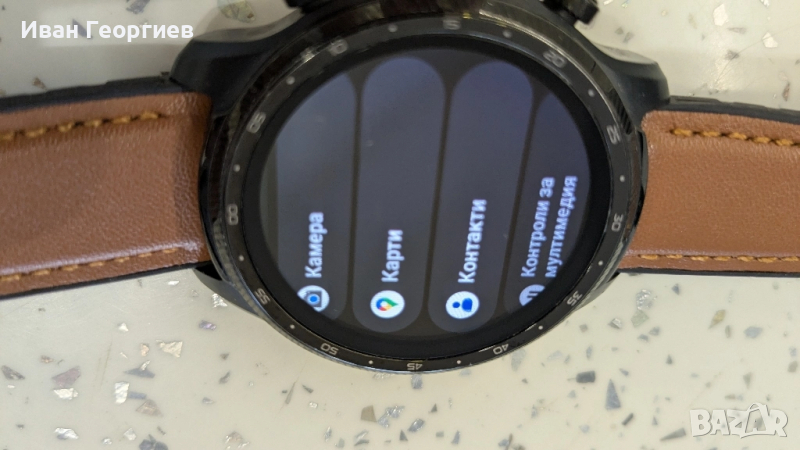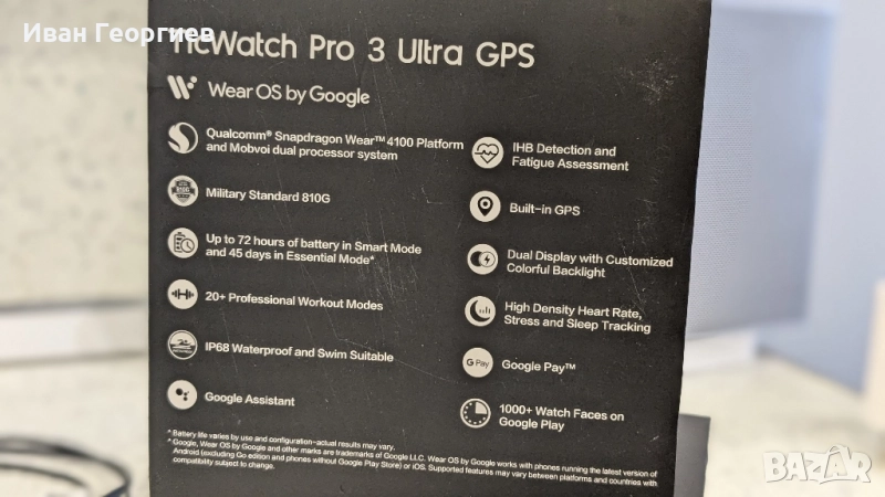 басейн, той е защитен с ниво на водоустойчивост IP68. Wear OS by Google Умният часовник Mobvoi ще бъде вашият ежедневен помощник. Позволява ви да извършвате плащания с Google Pay. Можете също да използвате Google Assistant, карти, за да получите информация за трафика и т.н. Възможно е също да слушате офлайн музика в Spotify. Персонализирайте външния му вид Персонализирайте външния вид на смарт часовника Mobvoi, за да отговаря на вашите нужди. Устройството предлага широка палитра от цветове, които можете да зададете на екрана на смарт часовника. Изберете 1 от 18-те налични цвята и придайте на TicWatch Pro 3 Ultra GPS уникален щрих. Включен кабел за зареждане на интелигентен часовник Ръководство за потребителя Марка Mobvoi Модел TicWatch Pro 3 Ultra GPS Размери 47 x 48 x 12,3 mm Тегло 41 g Цветна сянка черен Материал неръждаема стомана, найлон със стъклени влакна, силикон Екран Corning Gorilla Glass, покритие против пръстови отпечатъци Дължина на лентата 22 mm Работен система Wear OS от Google Чип Qualcomm® Snapdragon Wear ™ 4100, процесор Mobvoi Памет RAM: 1GB / ROM: 8GB Дисплей 1.4 “454 * 454 326ppi Пълен цвят Винаги включен дисплей AM OLED + FSTN Безжична свързаност Bluetooth 5.0 GNSS GPS + Beidou + Glonass + Galileo + QZSS NFC плащания Google Pay Сензори Акселерометър, жироскоп сензор, HD сензор за сърдечен ритъм PPG, SpO2 сензор, ниско забавяне Off-Body сензор, барометър < / td> Капацитет на батерията 577 mAh Издръжливост IP68, / MIL-STD-810G Работно време 45 дни (режим ESSENTIAL), 72 дни (режим SMART)