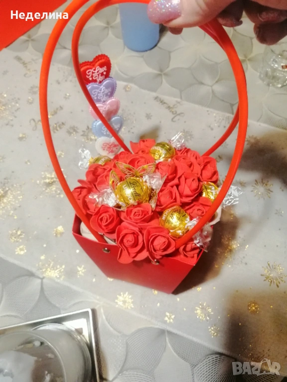 Кутия с цветя и вино може да се изработят в други цветове и вместо вино с бонбони. Идеално е за всеки повод. Размера е 30см дължина.