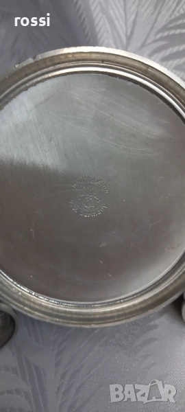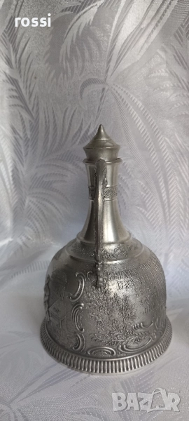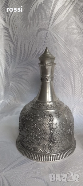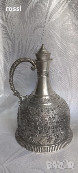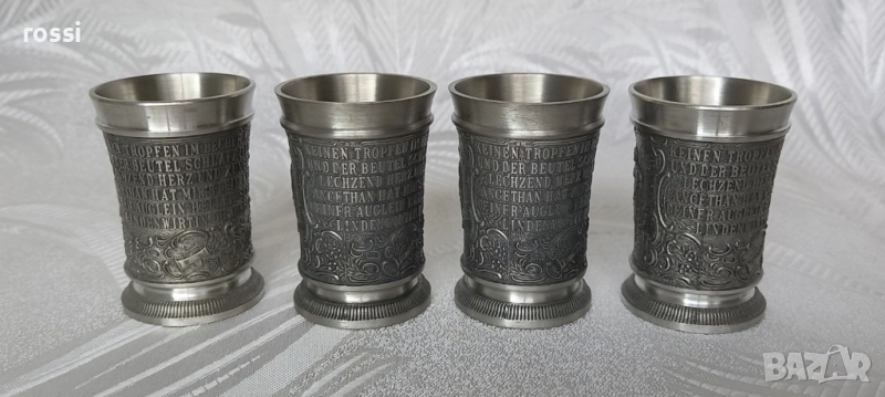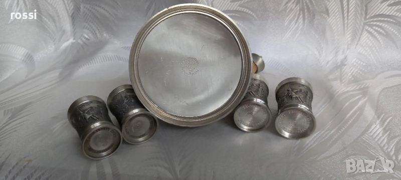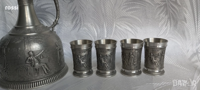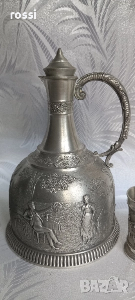 Красив старинен немски сервиз кана и 4 чашки за ракия от 70-те години на миналия век, 95% висококачествен калай Freiling zinn и 5% сребро (подходящ за храни и напитки), майсторска изработка с картина от серията "Lindenwirtin" - Гостилничарката под липата: знатен господин моли красивата гостилничарка да му сипе вино, че няма и капка в чашата му, а и портмонето му е празно. Текстът е записан на гърба на всеки елемент със старонемски шрифт.