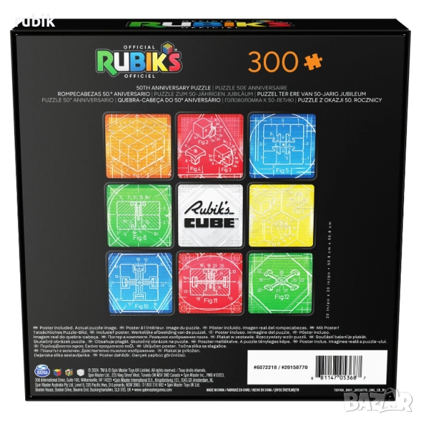 Отпразнувайте 50-годишнината на кубчето на Рубик по уникален начин! Това е един красив пъзел идеален за окачване на стената или за рамкиране. След сглобяването на 300-те части се създава квадратно изображение с размери 51 x 51 см, чиито девет цветни квадрата наподобяват оформлението на класическия куб на Рубик 3x3. Всеки квадрат е украсен с технически чертежи и линии, демонстриращи механиката на известния пъзел, а класическото лого на куба на Рубик е изобразено в центъра. Цветовете червено, жълто, зелено и синьо добавят жизнен щрих към композицията, придавайки ѝ модерно, инженерно усещане.