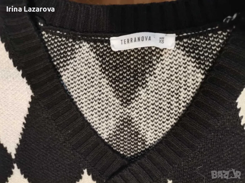 Къс пуловер с черни ромбове.