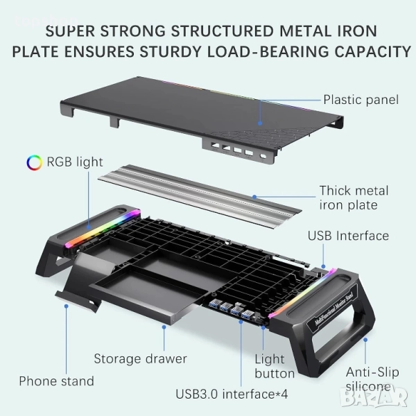 Чисто нова Стойка за монитор MOOJAY S57 за настолни RGB геймърски светлини с 4 USB 3.0 хъба...