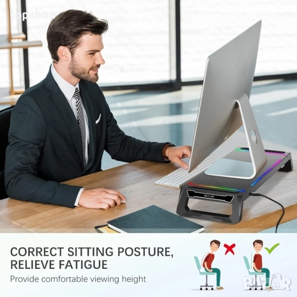 【Ергономичен дизайн】 Поставката за монитор за бюро е с ергономичен дизайн. Поставката за компютърен екран може да повдигне екрана на компютъра с 3,15 инча. Научно обоснованата височина ви позволява да избегнете навеждане, да коригирате стойката при седене и ефективно да облекчите умората от врата и гърба.