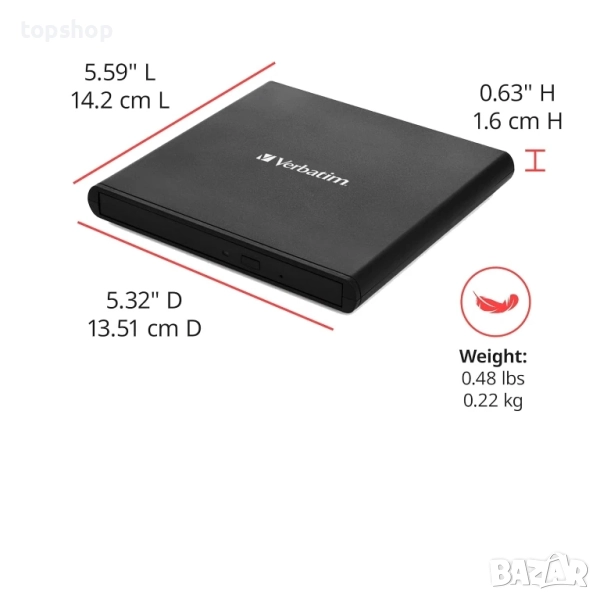 Чисто ново запечатано оптично устройство Verbatim External Slimline 43886, външно, USB-C, четене/записване, черно