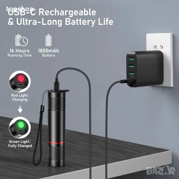 USB C акумулаторна батерия и кабел включени: Вградената 1800 mAh батерия може да работи до 16 часа при нормална употреба. Можете да зареждате този фенер директно чрез включения USB C кабел.
