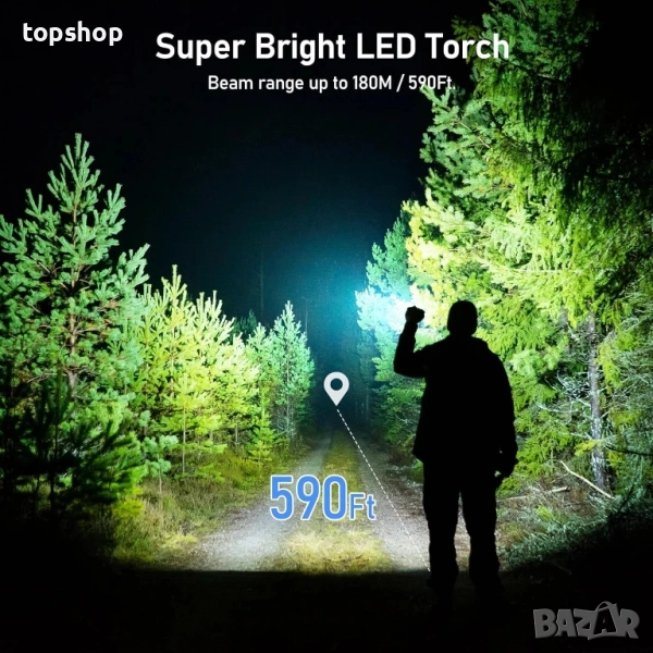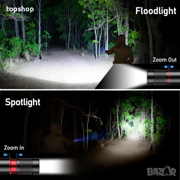 4 режима на осветление и мащабиране: Управление с един бутон на 4 режима на осветление: Високо/Ниско/Стробоскоп/SOS. Дизайнът с мащабиране регулира фокуса според нуждите, давайки ви свободата да изберете прожектор или прожектор за дълги разстояния или по-големи осветени площи.