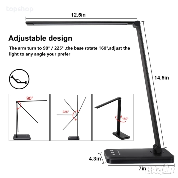 LED настолна лампа с литиева батерия, димируема за четене с USB порт за зареждане, 5 режима