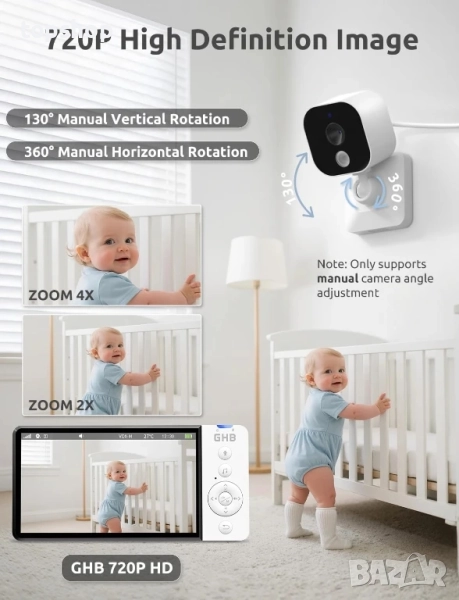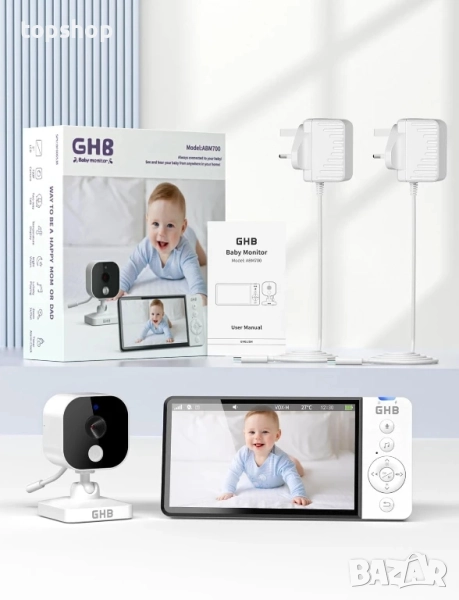 НОВ GHB Бебефон с камера и нощно виждане 5’’ 720P HD 5000mAh, IPS екран, VOX режим, двупосочно аудио