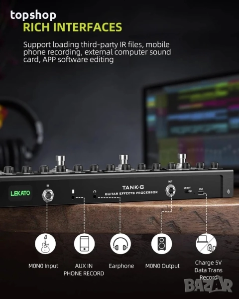 Чисто нов LEKATO Мултифункционален китарен ефект / педал с 36 пресета, редактируеми 4 модула, усилвател, хорус, забавяне, реверберация, IR CAB, тунер, BT връзка, запис на музика
