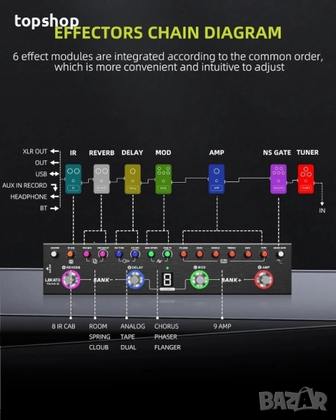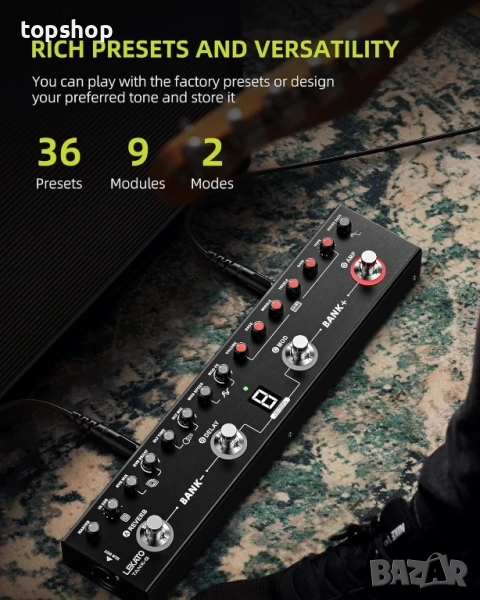 Богати пресети и „Направи си сам“ тон: Този мултиефектен китарен педал разполага с 36 пресета. Неговата верига от ефекти има модули като NOISE GATE, 9 AMP, 3 MOD (Chorus, Phaser, Tremolo), 3 DELAY (Analog, Tape, Dual), 3 REVERB (Room, Spring, Cloud), 8 IR CAB, които ви позволяват да персонализирате предпочитания от вас тон.