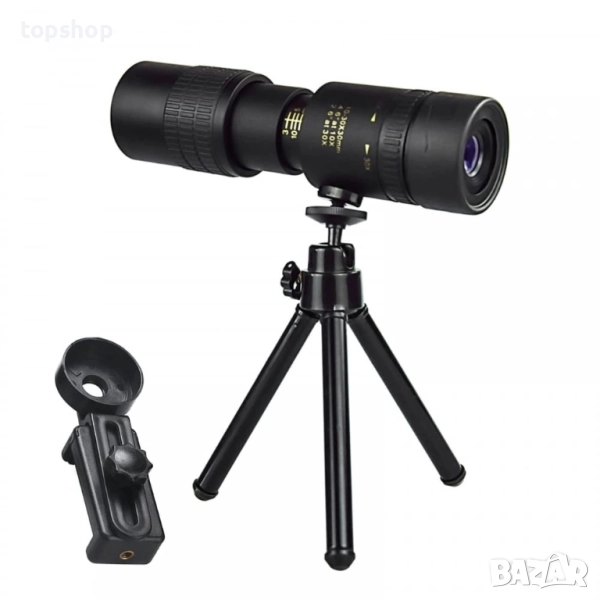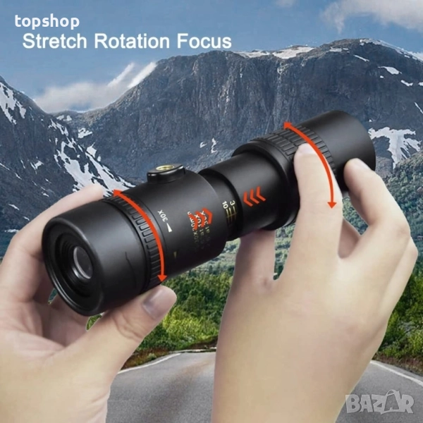 Лесен за употреба: завъртете окуляра, за да регулирате остротата и да фокусирате с фокусното колело. Оборудван с щипка за мобилен телефон и статив, които могат да бъдат свързани или използвани самостоятелно.