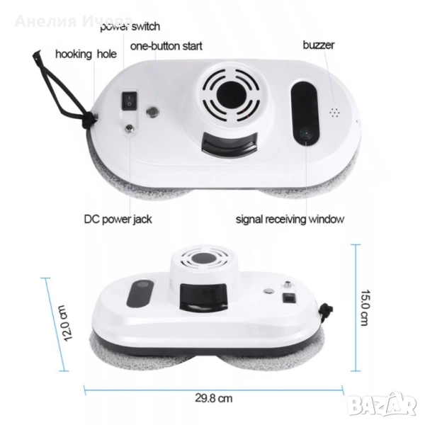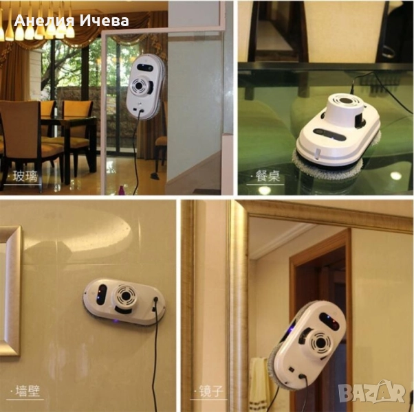 Робот за почистване на прозорци с дистанционно управление/ Материал: ABS пластмаса; Обхват на мощност: 100-240 V, 50-60 Hz; Консумация на енергия: 80 вата; Тип приемане: Вакуумна адсорбция; Скорост на почистване: 4,0 минути на квадратен метър; Функция: За сухо и мокро почистване; Режим на почистване: 3; Област на приложение: Стъкло, прозорец, външна стена, керамична плочка, вертикална маса; Разход: 75 W Дължина на кабела: 4 м;/ Размер на машината: 295 * 148 * 120 мм/Има защита от падане; с инфрачервено дистанционно, жироскоп за планиран път; След като стартирате уреда изчакайте 20 секунди, докато синята светлина престане да мига след това вече може да започнете работа с него. Това изчакване се дължина на факта, че робота си определя равнината.