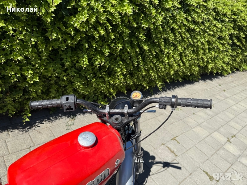 Моторчето е реновирано , много от частите са сменени нови и работи отлично. При интерес ще пусна и клип. Липсва в конзолата лкючето за дълги и къси светлини също така клаксон бутона , при снимките се вижда. Мигалите липсват но стойките са налични. Кормилото не е оригинално , в момента е с Renthal.