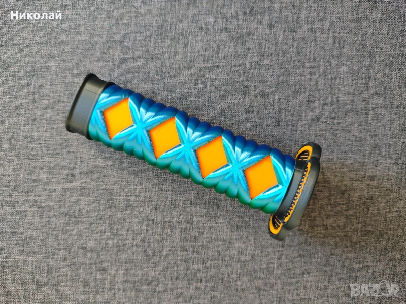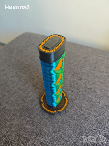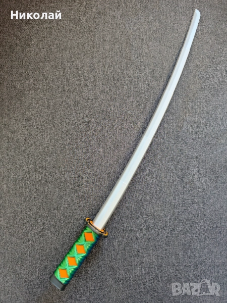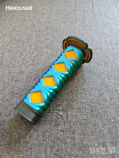 Освободете вътрешния си воин с този 3D принтиран меч катана, изработен с невероятни детайли за косплей или колекция. Дръжката е впечатляваща със зелено и синя оплетка (цукамаки / tsukamaki) с ярки оранжеви диамантени акценти, съчетани с черно-златна орнаментиран предпазител за ръката (сеппа / seppa). Разтегателното му сребристо острие (тошин / toshin) добавя динамичен и интерактивен елемент, което го прави идеален за костюми, вдъхновени от самураи, аниме конвенции или като уникална декорация.