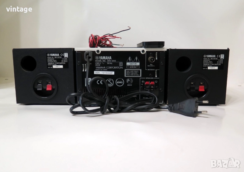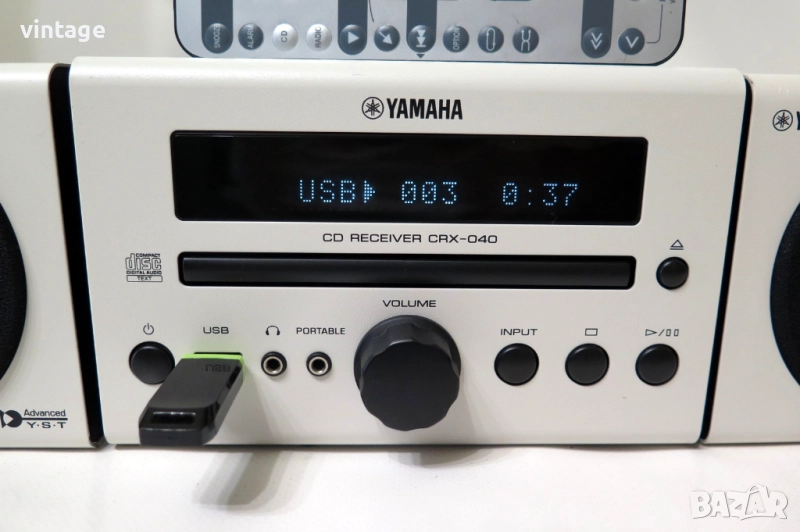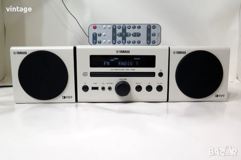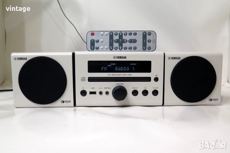 Дизайнерска аудио система Yamaha CRX-040, отлична технически, много добър външен вид. Цифров тунер с RDS, CD плеър (разчита матрични и записани аудио дискове), USB порт, iPod/iPhone порт (не е изпробван поради липсата на подходящи устройства). Корекции: bass, treble. Дистанционно управление, не е оригинално за модела, покриващо част от функциите. Много добър звук за размерите си! Приложените снимки и видео са реални!