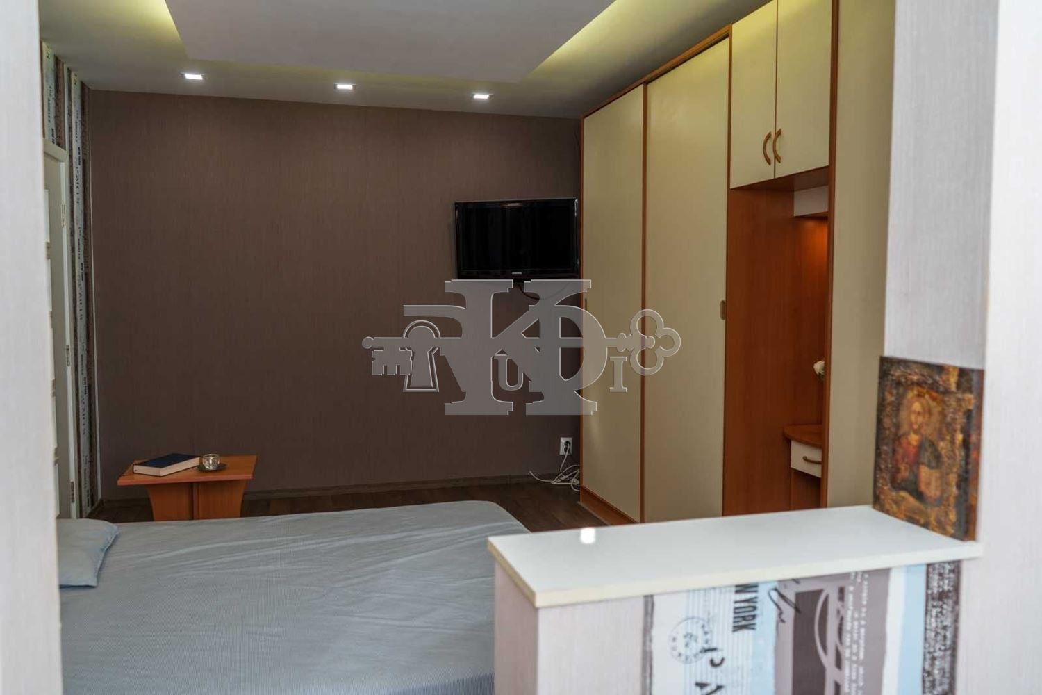 Уютна спалня с вграден гардероб на нива и окачен таван;