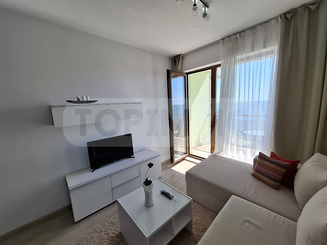 Разположен в луксозна сграда, с контрол на достъпа. Разпределение: антре, всекидневна с кухненска част с излаз на тераса с панорама море, спалня, санитарен възел.